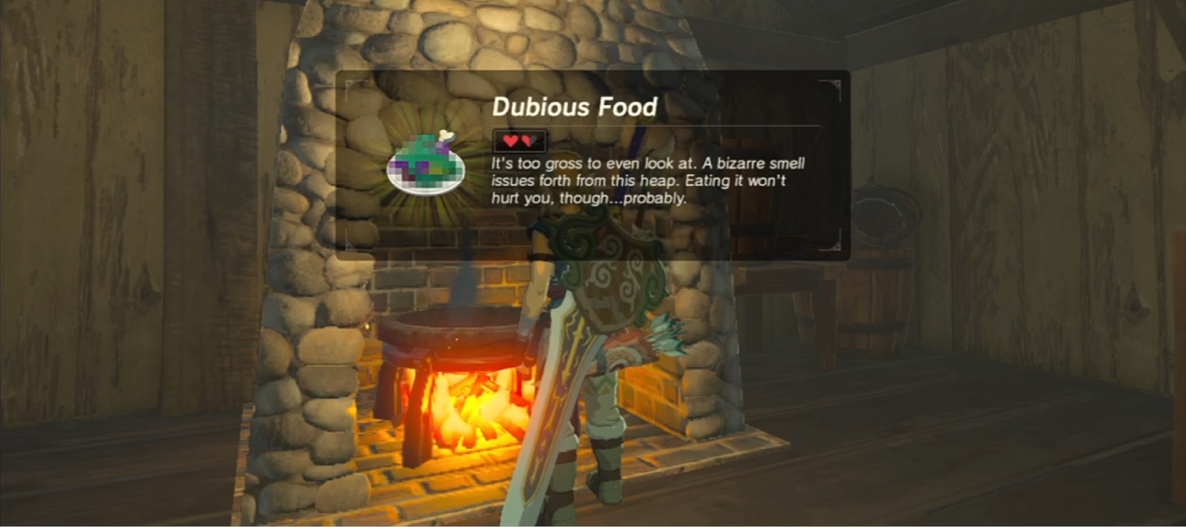 Many times have I put in ingredients to a dish to test what they’d make, only for the result to be some Dubious Food. This heals only one heart, usually canceling out the effects of your ingredients. If you make a good recipe, the game lets you check what went into it (go to the cooked food tab and select the dish, then select “recipe”). To avoid this (because it wastes ingredients), never try to cook insects on their own, never put monster parts in with food, unless you want to turn just your monster parts into a healing dish, and never cook rock salt on its own. Also, never add ores or wood to a dish, or else it’ll turn into Rock-Hard Food, healing you only a quarter of a heart. Learning to cook properly can allow you to create food with a myriad of buffs for Link.